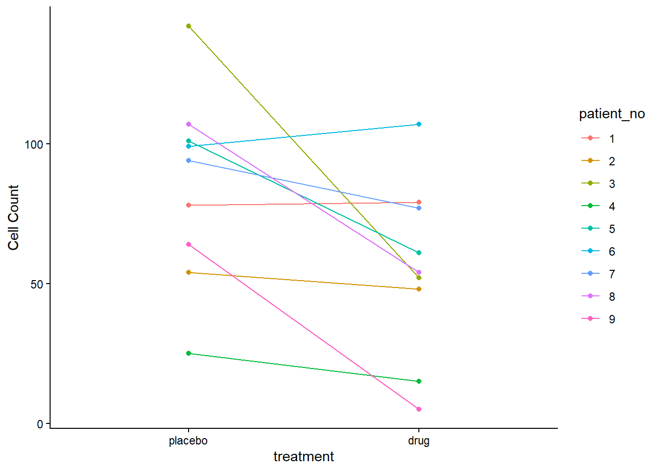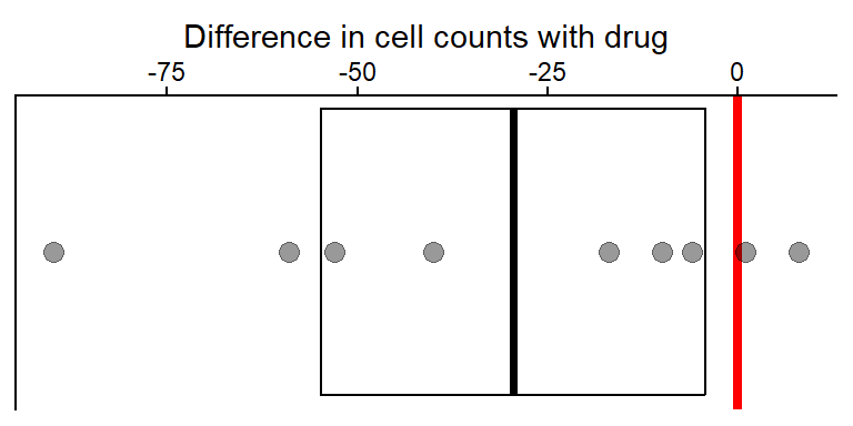 The drug lowered cell counts by an average of 29.6 cells relative to the placebo. 95% CIs are from -54.8 to -4.3 (i.e., if we repeated the experiment, 95% of the time the true mean would be in this interval). At the same time this 95% CI is pretty wide, which is to be expected with only 9 individuals in the study and a decent about of “patient-to-patient” variability in cell count differences (including a couple cases that had 0 or positive count differences).