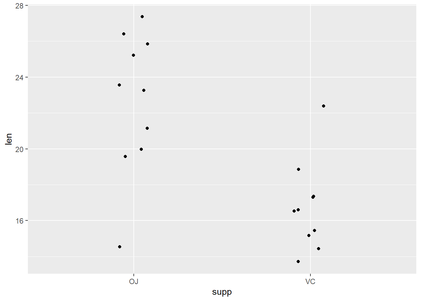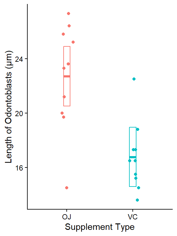 While the full data set has 1 numeric response (len) and 2 categorical explanatory variables (Supplement Type and Dose) we are going to reduce the data set to only one explanatory variable (supp: Supplement Type) with 2 levels (OJ: Orange Juice; VC: Ascorbic Acid) by filtering the data to select only guinea pigs that received a dose == 1