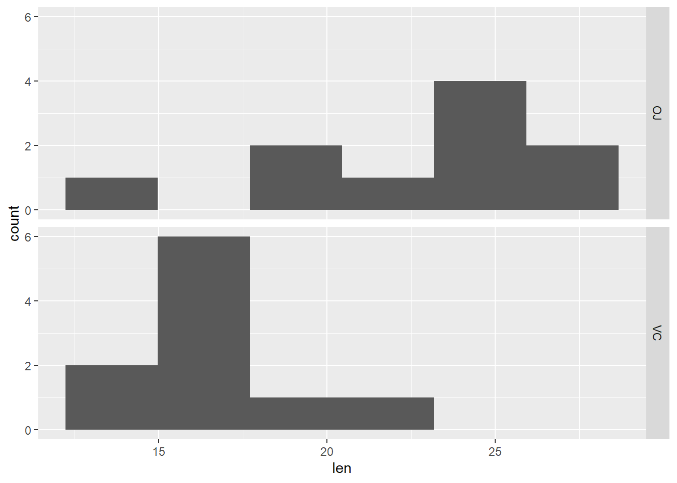 In the ToothGrowth data set the response is the length of odontoblasts (cells responsible for tooth growth) in 60 guinea pigs. Each animal received one of three dose levels of vitamin C (0.5, 1, and 2 mg/day) by one of two delivery methods, orange juice or ascorbic acid (a form of vitamin C and coded as VC).